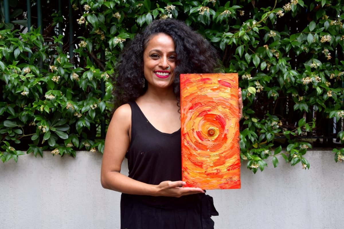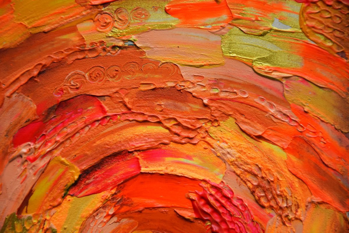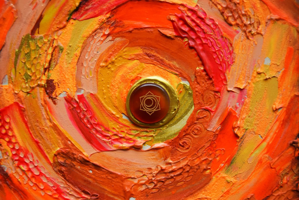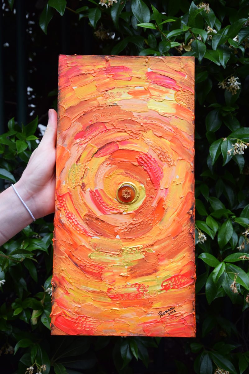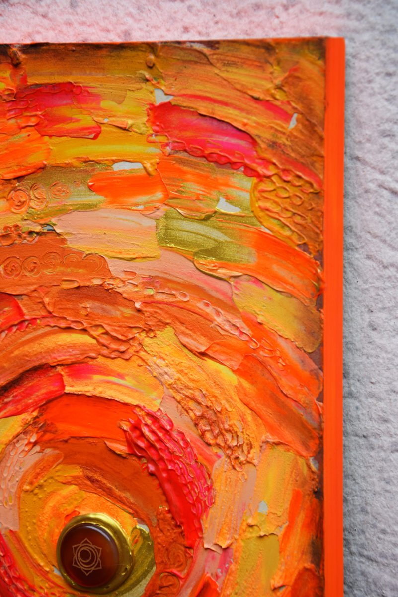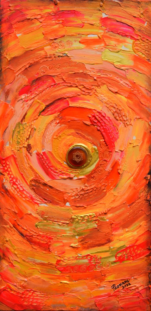 This painting carries the energy of Sacral Chakra which is represented by color orange. It houses relationships, creativity and sexuality. This painting is adorned by the Crystal, Carnelian.