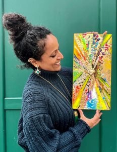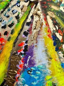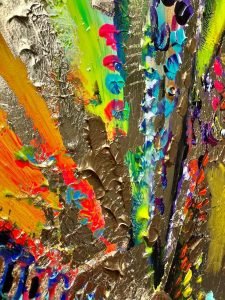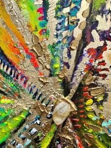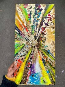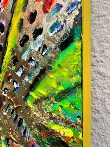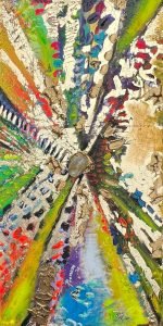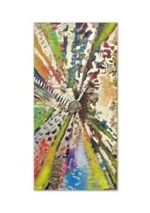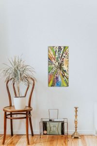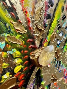 This painting carries the energy of Solar Plexus Chakra which is represented by yellow color. It holds the energy of the sun which is masculine in nature. It is the center of our personal strength, outward action and confidence. Citrine crystal in the center helps balance this chakra!